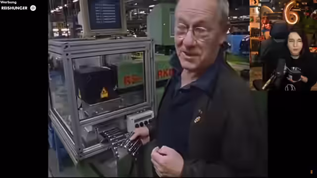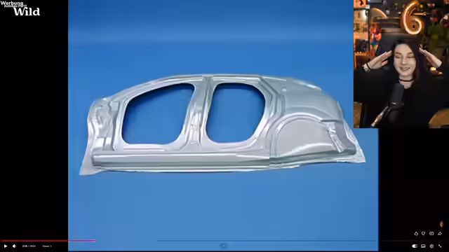 00:40:52Der dritte Teil der Dokumentation zeigt die Fertigung der Autotüren. Ähnlich wie bei der Karosserie werden die Türen aus Blech in mehreren Pressen geformt. Anschließend werden das Innenteil und das Außenteil zusammengefügt und in einem Prozess gefaltet, sodass sie stabil sind. Der Streamer ist erstaunt über die komplexe Präzision, mit der die Türen produziert werden. Parallel werden unzählige weitere kleine Teile für das Auto in vollautomatischen Pressen hergestellt, sodass ein Auto insgesamt aus 395 Pressteilen besteht. Ein Beispiel ist das Lenkrad, das später aus fünf Teilen zusammengesetzt wird.