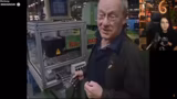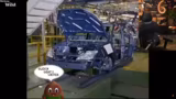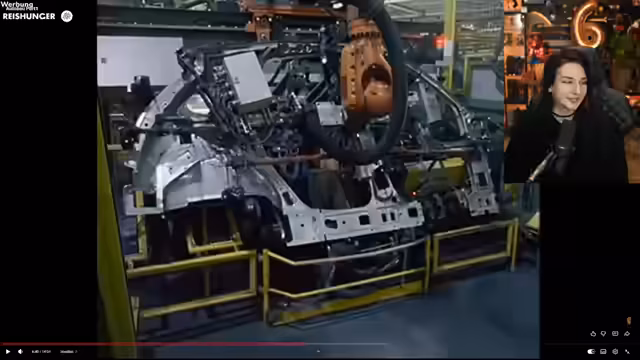 00:54:11Der fünfte Teil zeigt den Zusammenbau der Karosserie. Die Seitenteile und der Fußboden werden von Robotern zu einer stabilen Einheit zusammengesetzt. Danach werden die Dächer, die je nach Modell variieren, von einem Hebelmechanismus aufgesetzt. Der gesamte Prozess findet unter ständiger Laserkontrolle statt, um Genauigkeit zu gewährleisten. Anschließend werden Türen, Kotflügel und die Motorhaube von Robotern montiert und festgeschraubt. Der Streamer ist beeindruckt von der Effizienz des gesamten Produktionsprozesses.