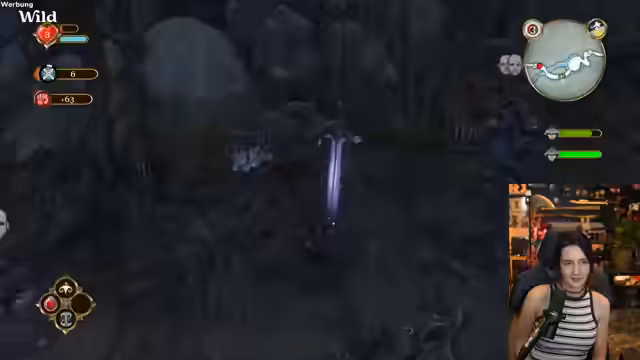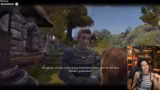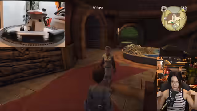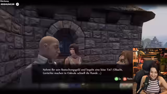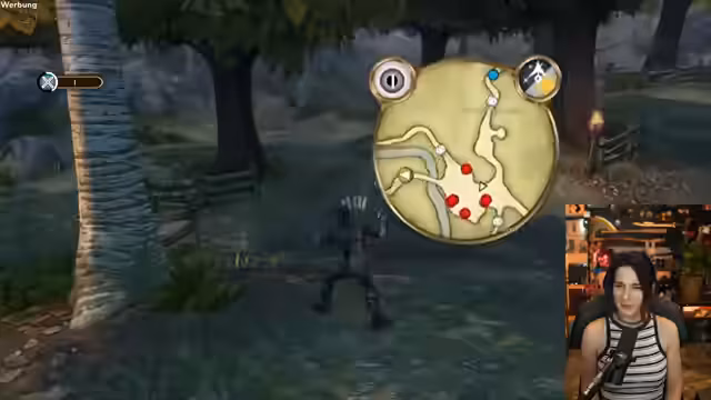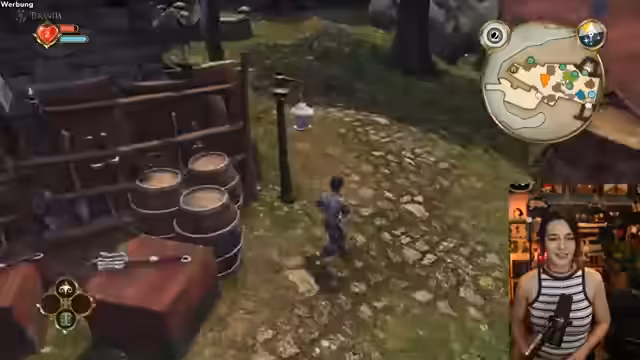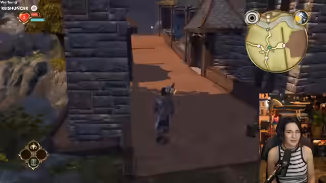01:22:47Im Spiel 'Fable Anniversary' steuert der Streamer den Helden Oakvale. Er trifft auf einen Mann, der ihm eine goldene Münze für jede gute Tat anbietet und ihm rät, sich nicht an eine einzelne Frau zu binden. Daraufhin trifft der Streamer auf eine Frau, die nach einem Geschenk für ihre Schwester sucht. Er kauft eine Süßigkeitsschachtel und kann damit die Schwester glücklich machen. Dies wird als gute Tat gewertet. Er wird auch Zeuge eines Ehepaars, das sich streitet, und hört einen Dialog, der durch wiederholte Beleidigungen in einer Endlosschleife gefangen zu sein scheint. Er ist beeindruckt von der Dialogtiefe aus dem Jahr 2004.