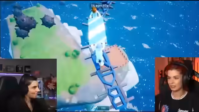 01:50:28Es gibt viele Probleme mit der Steuerung der Spielfiguren. Die Spielerinnen tippen oft falsch. Die Ansicht des Spiels wird als schwindelig beschrieben. Manchmal verlieren die Figuren das Gleichgewicht. Das führt zu unkontrollierten Sprüngen. Das Spiel hängt manchmal. Der Streamer fragt den Chat nach Tipps. Die Steuerung wird als sehr anstrengend empfunden.