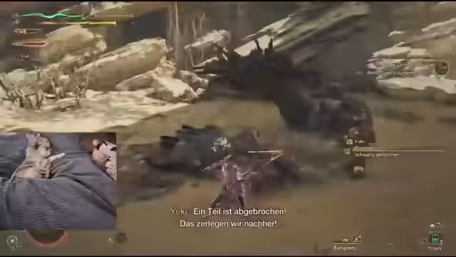 08:32:13Der Fokus liegt auf der Jagd auf ein großes Monster, das Doshaguma, und den dabei auftretenden Spielmechaniken. Es kommt zu technischen Verzögerungen und Missverständnissen bei der Steuerung. Der Sprecher kämpft mit der Waffenauswahl und dem Waffenwechsel, während er das Monster verfolgt und ihm Schere zufügt. Sein Saikri-Yuki erwähnt er dabei mehrfach.