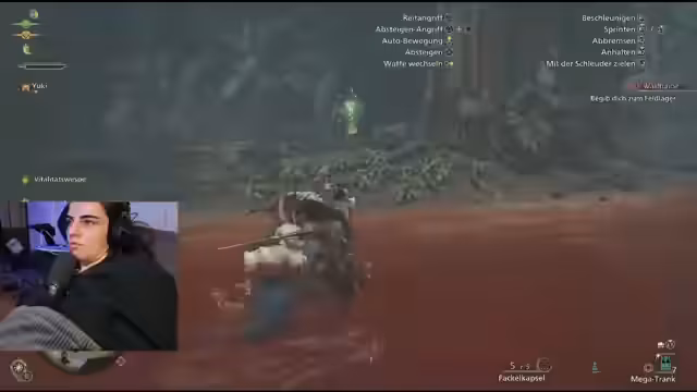 07:20:16Nach der erfolgreichen Konfiguration der Audiosysteme setzt der Streamer das Spiel fort. Er ist nun im Dorf und hat die Aufgabe, eine monsterbedrohte Person zu retten. Er entscheidet sich für das Großschwert als Waffe, obwohl er die Kontrolle zunächst als schwierig empfindet. Nachdem er die Mission angenommen hat, begibt er sich auf die Jagd, trifft auf ein wildes Tier und stellt fest, dass er in den Kämpfen mehr Übung benötigt, um die Angriffe und Ausweichmanöver zu meistern.