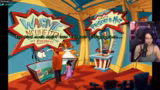 03:59:03Der Streamer besucht verschiedene Locations und spricht mit Charakteren. Im Pumpotron trifft er auf Bodybuilder, die eine gefahrvolle Übung vorführen. Im Laden "Wack Me" werden Prügelwerkzeuge wie ein Boxhandschuh und eine Spritzblume beworben, die Kunden verletzen können. In der Kneipe wird versucht, ein Quiztelefon zu nutzen, um Informationen zu erhalten, was jedoch fehlschlägt. Die Suche nach der verstopften Toilette und einem Polizisten wird fortgesetzt.