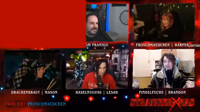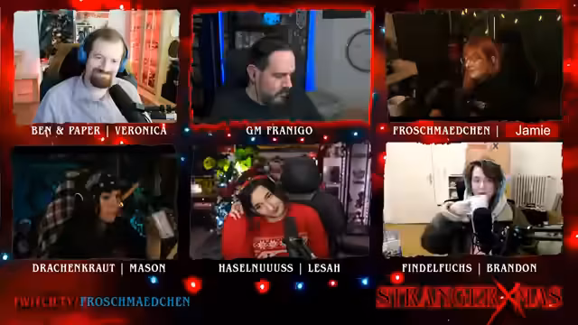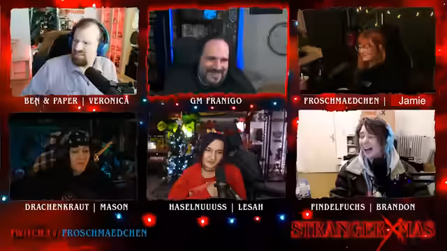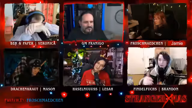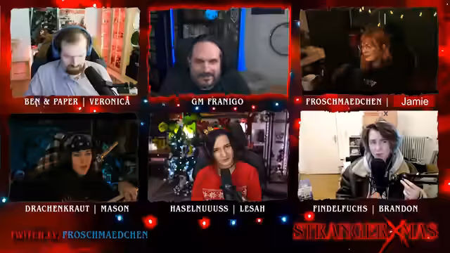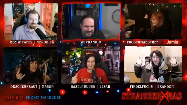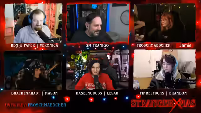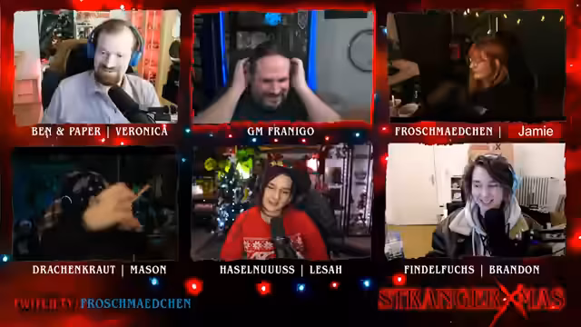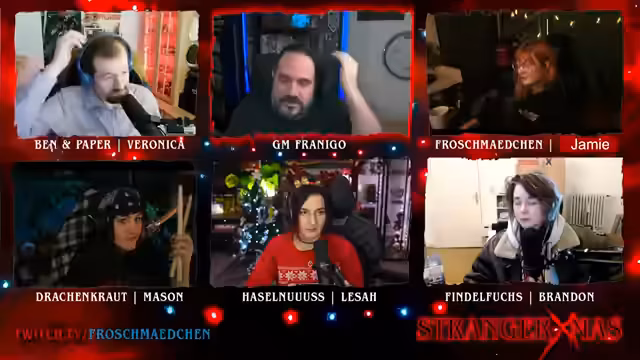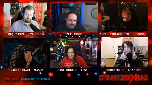 06:33:14Das jährliche Weihnachts-Pen & Paper mit dem Thema 'Stranger Things' startet in den 1980ern in Merlin, Indiana. Charaktere werden vorgestellt: Brandon (Sportler), Veronica (Cheerleaderin), Jamie (Journalistin), Mason (Musiker) und Lisa (Beobachterin). Die Szene ist ein Wrestling-Match der Highschool gegen das Nachbarstadt Hawkins, bei dem die Stimmung in der Turnhalle aufgeladen ist. Brandon bereitet sich im Umkleideraum auf das Match vor, während die anderen Zuschauer sind.