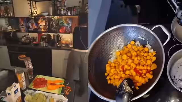 00:32:43Der Stream beginnt mit der Zubereitung der Mohnfüllung für den Käsekuchen. Der Streamer kocht Mohnsamen mit Milch und Zucker auf, um eine cremige Masse zu erhalten und unterbricht dabei für kleine Pausen und Chatinteraktionen. Danach wird der Teig für den Käsekuchen Quark, Puddingpulver, Grieß und Gewürze zubereitet. Für die Sesamnudeln werden Zwiebeln und Paprika in Sesamöl angedünstet, gefolgt vom Hinzufügen von Karotten, Brokkoli und Kichererbsen, um das Gericht abzurunden.