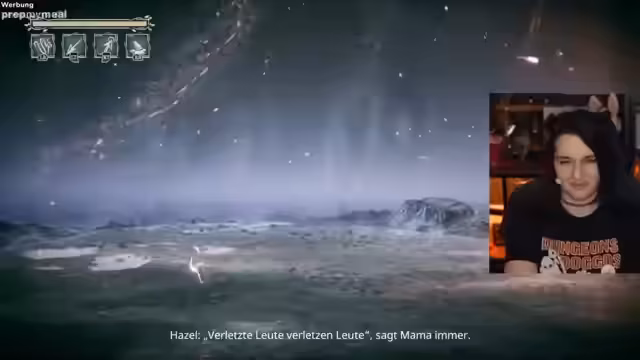 03:29:59Der Streamer muss sich einer actionreichen Flucht stellen, bei der er rennen und springen muss, um nicht gefressen zu werden. Die Musik wird als extrem aufregend beschrieben, und er ist sichtlich unter Druck. Dabei stolpert er über ein geheimes zweites Paar Augen, das ihm beim Chatlesen hilft. Der Wechsel zwischen Kampfszenen und Storypassagen wird als gelungen empfunden, da die Kämpfe auf Normal Schwierigkeit nicht zu lang erscheinen und das Spiel einen guten Rhythmus hat.