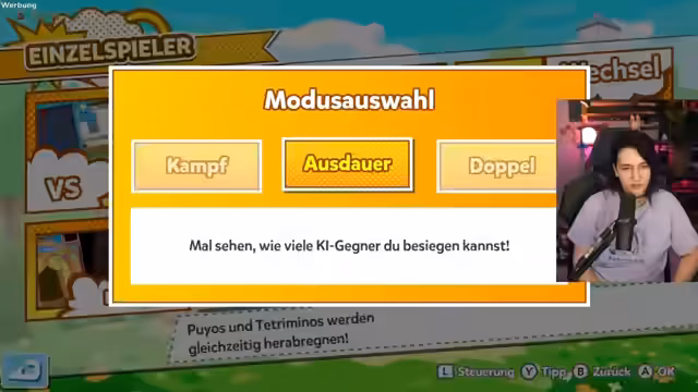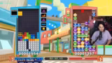 01:38:55Der Streamer spielt einen intensiven Wettkampf gegen einen im Spiel integrierten Bot. Er testet seine Fähigkeiten im Puyo-Puyo-Teil des Spiels, während sein Gegner Tetris spielt. Der Verlauf ist geprägt von Nervosität und schnellen Entscheidungen. Er verliert mehrere Runden, was zu humorvollen Frustreaktionen und dem Entschluss führt, das Spiel noch einmal von vorne zu beginnen.