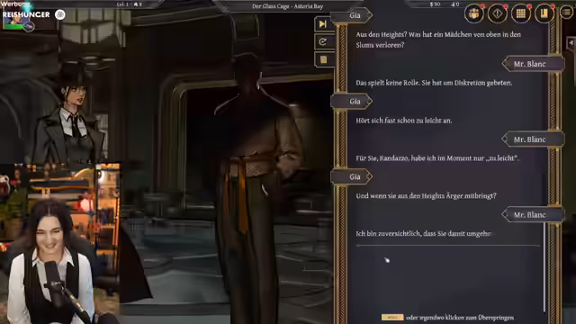 02:48:47Nach dem Setup der Spielschwierigkeit und der Auswahl des Charakters beginnt der eigentliche Spielausschnitt. Die Spielerin schlüpft in die Rolle einer Schmugglerin und nimmt ihren ersten Auftrag von einem namens Mr. Blanc an. Die Mission besteht darin, einen Transport zu erledigen, was sie in eine riskante Situation führt. Die ersten Interaktionen mit der Spielwelt zeigen die komplexe Menüführung und die Möglichkeit, Dialoge auf verschiedene Weise zu führen, was von der Streamerin als sehr positiv wahrgenommen wird.