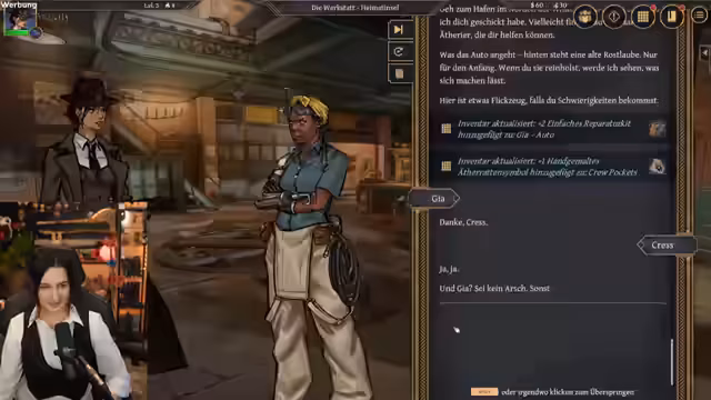 04:24:13Nachdem ein neues dunkelblaues Fahrzeug kostenlos erworben wurde, wird die Werkstatt genauer erkundet. Hier können Fahrzeugteile ausgetauscht, aufgewertet und Lackierungen angepasst werden, um die Kampfwerte zu verbessern. Anschließend beginnt die eigentliche Mission: Das Stream-Team agiert als Schmuggler, die die Person Nelly transportieren sollen. Ein anfänglich als einfach geltender Job gestaltet sich jedoch als komplexer, da sie verfolgt wird.