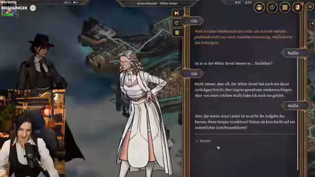 03:53:30Die Story vertieft sich und es kommt zu einer emotionalen Konfrontation. Die Spielfigur, eine Schmugglerin namens Cressa, bittet die Spielerin um Hilfe bei der Flucht, nachdem ihre Kollegen getötet wurden. Sie enthüllt, dass ein mysteriöser 'schwarzer Hut' die Verfolgung angeführt hat. Die Atmosphäre wird unheimlich und dramatisch, als Cressa um ihre Rettung fleht und ihre traumatische Vergangenheit in Olympus Park anspricht.