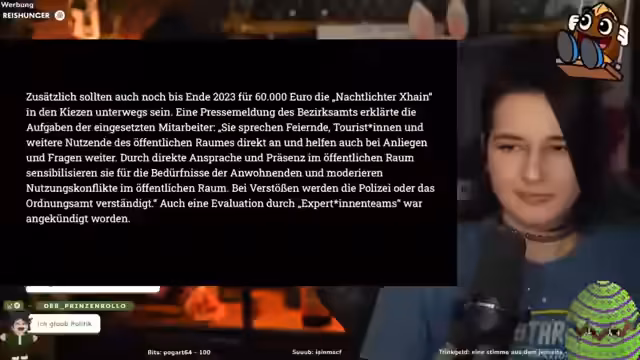 02:14:42Der Stream beschäftigt sich mit dem Konflikt zwischen Nachtleben und Nachtruhe in Berlin-Kreuzberg, wobei der Lärmomat und die ehemaligen 'Nachtlichter' als Lösungsansätze diskutiert werden. Es wird kritisch hinterfragt, ob eine solche Anzeige tatsächlich zu weniger Lärm führt und wie die 'Nachtlichter', die nachts im Kiez patrouillierten, die Situation moderieren konnten. Die offiziellen Zahlen zeigen zwar, dass es nach der Einführung des Lärmomats 50% ruhiger wurde, doch die Wirksamkeit und die Notwendigkeit dieser Maßnahmen bleiben kontrovers.