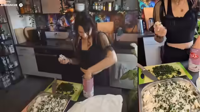 00:20:47Die Streamerin beginnt mit der Zubereitung eines Big Mac Salats. Sie holt alle notwendigen Zutaten wie Salat, Gurken, Tomaten, Hackfleischersatz oder normales Hackfleisch, Soja-Granulat, Knoblauch, Olivenöl und Sesam heraus. Sie plant, das Rezept zu verdoppeln, und stellt Fragen über die Menge der Zutaten. Die Küche beginnt sich zu füllen, und die Streamerin sucht nach einer passenden Glasschale für den Salat.