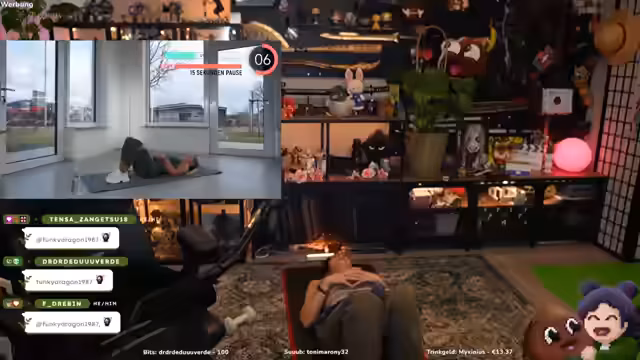 03:18:37Nach einem intensiven 15-minütigen Trainingseinheit, die Bauch, Beine und Po umfasste, wird das Workout beendet. Der Streamer hofft, dass den Zuschauern der Spaß gemacht hat, und fordert sie auf, mit einem Daumen hoch oder einem Kommentar zu reagieren. Nach dem Sport gibt es persönliche und teils humorvolle Kommentare zum training, Rückenbeschwerden und kleine Anekdoten aus dem Alltag, was eine lockere und entspannte Stimmung nach der anstrengenden Einheit schafft.