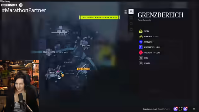 04:03:13Der Streamer startet eine Runde des Science-Fiction-Extraction-Spiels Marathon, das vom Sponsor Bungie unterstützt wird. Ziel des Spiels ist es, Ressourcen und Gegenstände auf einer Karte zu sammeln und diese nach dem Run zurück in den eigenen Rucksack zu bringen. Stirbt man im Spiel, verliert man alles gesammelte Gut. Vor dem Spiel werden verschiedene Waffen und Ausrüstung mit gesammelten Punkten gekauft, die durch die Nutzung von Upgrades und Fähigkeiten optimiert werden können.