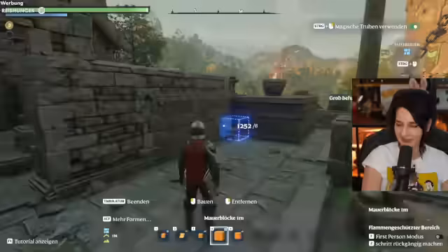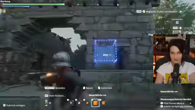 01:06:39Der Stream widmet sich dem Bau eines Gebäudes in einem Survival- und Aufbauspiel, das an Minecraft oder Velheim erinnert. Zuerst wird ein vorhandenes Gebäude gezeigt, dann mit dem Erweitern begonnen. Es wird über die Materialien wie Ziegel- und Fachwerkblöcke diskutiert und die Baupläne mehrmals geändert. Die Stimmung ist von der kreativen, aber auch von der überforderten Planungsphase geprägt.