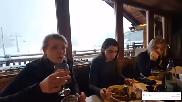 01:59:17Hasi erzählt eine Anekdote über eine Brotb Bestellung vom Vortag, die zu einer lustigen Situation führte. Es wird über die Portionsgrößen im Hotel diskutiert und festgestellt, dass das Preis-Leistungs-Verhältnis fair ist. Die Gesprächsteilnehmer überlegen, welche Piste als nächstes befahren werden soll, wobei die Wahl auf eine kurvige Strecke auf der Rückseite des Lifts fällt, in der Hoffnung auf ein sanfteres Gefälle. Es wird auch über die Möglichkeit diskutiert, Brezelknödel zu Hause selbst herzustellen. Ein Begleiter wird als "Hahn im Korb" bezeichnet, der sich in Gesellschaft der drei Frauen sichtlich wohlfühlt. Es folgt eine humorvolle Schilderung eines Saunabesuchs, bei dem Annika für Stimmung sorgte. Abschließend wird über die Qualität der Gulaschsuppe und die Pistenbedingungen diskutiert, wobei die Entscheidung für die weitere Streckenwahl noch aussteht.