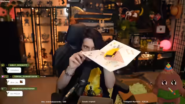 05:44:00Die weiteren Pakete enthielten eine Reihe kreativer und persönlicher Geschenke. Dazu gehörten eine kleine, selbstgebastelte Pizza mit Ananas, ein Mittelfinger-Shirt und einzigartige Fan-Art in Form von Figuren und einer Karte. Besonders beeindruckend war ein Bausatz für ein Schlagzeug und ein lizenziertes Merchandise-Produkt, das die Beziehung zur Community und die kreative Unterstützung durch die Zuschauer deutlich machte.