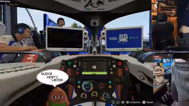 00:38:17Vor dem eigentlichen Gameplay gibt es technische Probleme, insbesondere mit der Kameraeinstellung und dem Aufbau. Der Streamer baut notgedrungen eine provisorische Konstruktion aus einem Wäschekorb für die Handykamera. Trotz anfänglicher Schwierigkeiten mit dem Start des Spiels F1 25 gelingt es, es zu starten und in den Trainingsmodus einzusteigen.