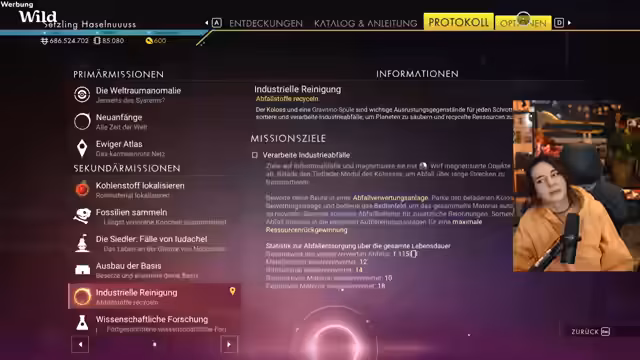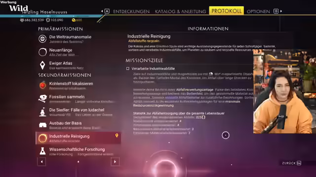 01:49:00Nach dem Start des neuen Updates reist der Streamer zu einer Bewertungsanlage, um industriellen Müll zu recyceln. Er muss verschiedene Abfallarten sammeln und in die richtige Anlage bringen. Dafür benötigt er spezielle Ressourcen wie Gravitino-Spulen. Die Mission ist herausfordernd, da die Abfallverarbeitungskomplexe weit verteilt sind und er sich Angreifern aussetzen muss.