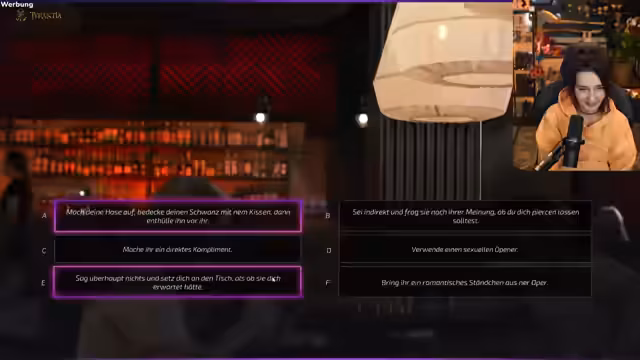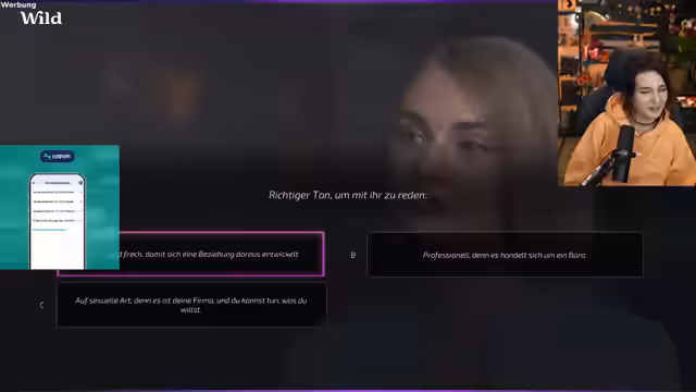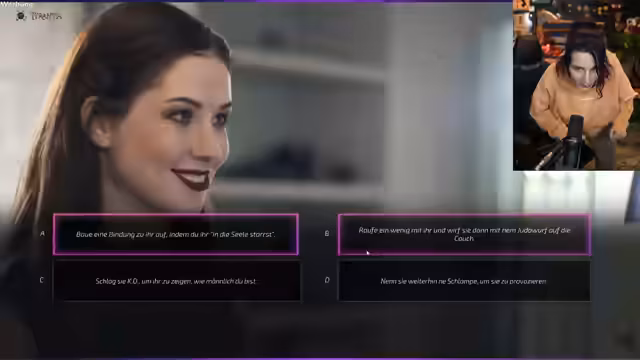 08:11:56Die Streamerin spielt ein absurdes Dating-Spiel und präsentiert den Chat verschiedene unkonventionelle Optionen, um eine fiktive Figur anzusprechen. Die Reaktionen im Chat sind gespalten, wobei einige Optionen als besonders unangenehm empfunden werden. Die Streamerin kommentiert diese Szenen mit Humor und stellt fest, dass es sich um eine rein fiktive und übertriebene Simulation handelt, die rein der Unterachtung dient und nicht als ernstzunehmendes Ratgebermaterial dient.
