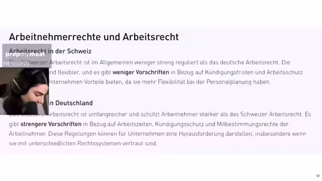 02:06:27Die Lebenshaltungskosten sind in der Schweiz zwar deutlich höher, aber die höheren Nettogehälter und die niedrigeren Steuern kompensieren dies, was oft zu einer höheren absoluten Sparquote führt. Die Arbeitswelt unterscheidet sich von Deutschland durch längere Arbeitszeiten (41-42 Wochenstunden), weniger Feiertage und eine höhere Jobdynamik. Jobwechsel sind häufiger und der Arbeitnehmerschutz schwächer, was den Schweizer Arbeitsmarkt agiler macht.