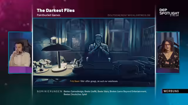 02:59:42The Darkest Files wird als ein weiteres Spiel vorgestellt, das für mehrere Kategorien, darunter Beste Story, Beste Grafik, Bestes Deutsches Spiel, Bestes Game Beyond Entertainment und Bestes Spiel, nominiert ist. Es wird betont, dass das Spiel ein sehr ernstes und dunkles Thema behandelt, da es in der Nach-NS-Zeit spielt und sich mit der Verfolgung von NS-Verbrechen befasst. Eine kurze Demo des Spiels wird gestartet, die die Spieler in die Rolle einer jungen Staatsanwältin versetzt, die unter Generalstaatsanwalt Fritz Bauer arbeitet. Der Artstyle und die Synchronisation des Spiels werden erneut gelobt. Das Spiel beginnt mit der Einführung in das Büro und die ersten Aufgaben, wie das Durchlesen von Akten und das Einladen von Zeugen. Das Notizbuch-System, das Hintergrundinformationen liefert, und die Möglichkeit, wichtige Details in den Akten zu markieren, werden erklärt. Die Streamer betonen die Tiefe des Spiels und die Bedeutung, sich mit solchen ernsten Themen auseinanderzusetzen, auch wenn es herausfordernd ist.