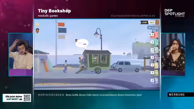 03:44:38Bevor das vorletzte Spiel des Streams beginnt, wird eine Umfrage gestartet, um das beste deutsche Spiel des DEP 2025 zu ermitteln. Die Zuschauer können über einen QR-Code oder einen Link abstimmen. Die zur Auswahl stehenden Spiele sind Lonely Mountains, Snow Riders, The Darkest Files und Tiny Bookshop. Anschließend wird Tiny Bookshop vorgestellt, ein gemütliches Spiel, in dem man einen kleinen Buchladen am Meer aufbaut. Das Spiel ist in den Kategorien beste Grafik, bestes Indie-Game, Innovationspreis und bestes deutsches Spiel nominiert. Während der Vorstellung wird über Lesegewohnheiten und die Vorliebe für Berge oder Meer diskutiert, wobei die Streamerin ihre Abneigung gegen Möwen am Meer äußert. Es wird auch darauf hingewiesen, dass die Meere weniger erforscht sind als das Weltall.