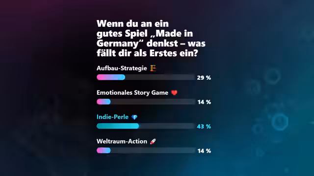 00:43:32Nach dem Gameplay von 'Bauhaus Bonk' werden die Ergebnisse der Umfrage präsentiert, bei der die Zuschauer abstimmen konnten, was ihnen zuerst einfällt, wenn sie an ein gutes Spiel Made in Germany denken. Die Optionen waren Aufbaustrategie, emotionale Storygame, Indie-Perle und Weltraum-Action. Die Ergebnisse zeigen, dass Indie-Perle mit 50% die beliebteste Antwort ist, gefolgt von Aufbaustrategie (33%) und Weltraum-Action (17%), während emotionale Storygames 0% erhielten. Die Moderatoren kommentieren die Ergebnisse und leiten zum nächsten Spiel über: 'Drova', einem Dark Fantasy Action-RPG, das in einer keltisch angehauchten Welt spielt und für die Kategorie 'Beste Story' nominiert ist. Das Spiel wird mit Gothic verglichen und für seine offene Welt, Fraktionen und die Möglichkeit, Entscheidungen mit weitreichenden Konsequenzen zu treffen, gelobt. Die Entwickler, Just 2D Interactive, werden ebenfalls erwähnt, da sie ihre Arbeit live auf Twitch gezeigt haben.