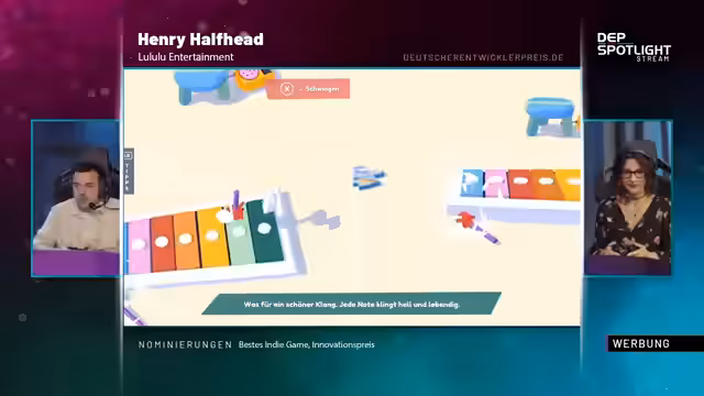 Der DEP-Spotlight-Stream 2025, moderiert von Hazel und Daniel, stellt zehn nominierte Spiele für den Deutschen Entwicklerpreis aus Deutschland, Österreich und der Schweiz vor. Der Preis wird von Games NRW organisiert. Eine Grußbotschaft von Budi, Moderator der DEP-Gala, leitet die Vorstellung ein. Interaktive Umfragen während des Ablaufs ermöglichen die Beteiligung der Zuschauer. Das erste gezeigte Spiel ist 'Bauhaus Bonk', nominiert als bestes Casual Game.