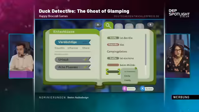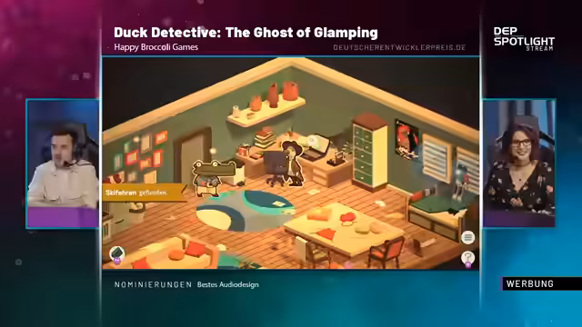 01:33:35Nach „Henry Half-Head“ wechseln die Streamer zu „Duck Detective: The Ghost of Glamping“, einem gemütlichen Krimi-Spiel, in dem sie einen Entendetektiv spielen, der Verbrechen aufklären muss. Das Spiel ist für das beste Audio Design nominiert. Die Geschichte beginnt mit dem Detektiv Eugene, der sich Sorgen um seine Ex-Frau Hannah macht, da sie nicht auf seine Nachrichten antwortet. Die Spieler lernen die Mechanik der Entschlüsse kennen, bei der sie Hinweiswörter sammeln, um Lücken in ihren Schlussfolgerungen zu füllen. Sie untersuchen Eugenes Zimmer, finden Hinweise unter dem Kissen und entdecken, dass er einen Urlaub plant. Sie treffen auf Eugenes Mitbewohner Fredderson, ein Krokodil, und untersuchen dessen Umgebung, um weitere Hinweise zu finden. Sie entdecken, dass Fredderson einen YouTube-Kanal abonniert hat, der sich mit „Lost Places“ beschäftigt, und dass er eine Freundin hat. Die Spieler sammeln Informationen über Fredderson und versuchen, seine Beziehung zu Hannah zu verstehen, während sie sich auf den Weg zum „Sunny Lake“, einem angeblich verfluchten Campingplatz, machen.