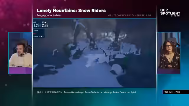 01:57:19Der Stream wechselt zum nächsten Spiel, „Lonely Mountains: Downhill“, einem Racing Game, bei dem die Spieler auf Skiern unterwegs sind. Das Spiel ist nominiert für die beste technische Leistung, das beste deutsche Spiel und das beste Game Design. Die Streamer sind gespannt auf das Gameplay und die Gründe für die Nominierungen. Sie bemerken sofort die realistische Darstellung des Schnees und die Spuren, die beim Fahren entstehen. Die Spieler müssen Bestzeiten aufstellen und verschiedene Strecken meistern. Es wird erwähnt, dass das Spiel einen Online-Koop-Modus hat, aber die Streamer spielen zunächst alleine. Sie diskutieren über die Schwierigkeit des Spiels, die Kameraperspektiven und die Freude am Skifahren. Es werden auch persönliche Anekdoten aus der Schulzeit und Erfahrungen mit Skifahren geteilt, darunter ein humorvoller Vorfall mit Pfeffer im Tee. Die verschiedenen Pistenfarben (blau, rot, schwarz) und ihre Bedeutung werden angesprochen, und die Spieler testen verschiedene Teegeschmäcker und deren Wirkung.