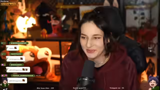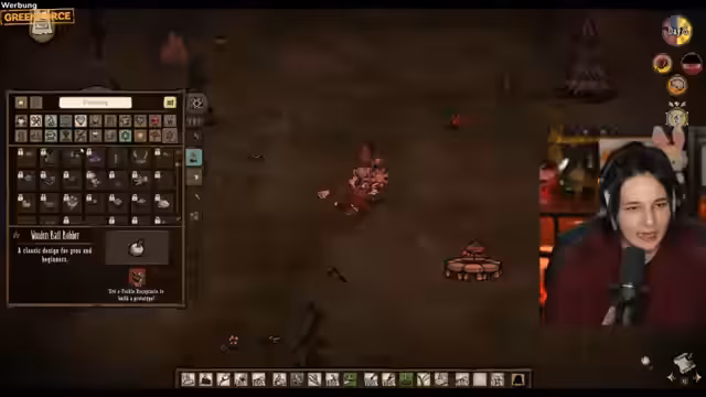 02:36:12Im Spiel Don't Starve Together hören die Spieler eine unheimliche Musik und müssen eine Hand davon abhalten, ihr Feuer zu stehlen, indem sie darauf treten. Die Streamerin bemerkt, dass ihr Lebensstand niedrig ist und fragt, ob es sich um einen allgemeinen Zustand oder einen Fehler handelt. Es wird überlegt, wie man den Lebensstand verbessern kann, eventuell durch Heilsalben, für die Spinnenseide benötigt wird. Die Streamerin bietet an, etwas Essen in eine Kiste zu legen. Sie erzählt eine Geschichte, wie sie beim Spaziergang mit Freunden von einem Vogel auf den Kopf geschissen wurde und Haare waschen musste. Im Zivildienst erlebte sie, wie eine Pflegerin in einen Lagerraum rannte und laut rülpste, was ihr peinlich war, als sie bemerkte, dass jemand anwesend war.