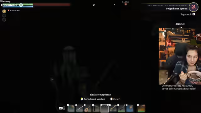 01:36:44Der Streamer konzentriert sich auf das Erledigen von Quests und das Sammeln von Ressourcen. Er brauchte gegrillten Steinpilz für eine Aufgabe. Er geht zum Alchemisten, der ihm einen schwarzen Kessel für die Herstellung von Tränken überlässt. Beim Versuch, bestimmte Gegner zu besiegen, stößt er auf große Schwierigkeiten, insbesondere mit Fliegen, die viel Ausdauer verbrauchen und ihn frustrieren.