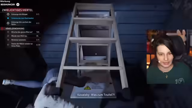 02:25:41Nach der grundlegenden Reinigung beginnt die zeitaufwendige Aufgabe, die Möbel wieder an ihren ursprünglichen Platz zu stellen. Gleichzeitig sucht der Streamer nach verbleibenden Beweisen und Spuren. Er findet einen Schlüssel und eine Leiter, die ihm den Zugang zu einem Dachboden ermöglichen, wo weitere Aufgaben auf ihn warten. Das Apartment wird als eine Art Rätselfeld beschrieben.