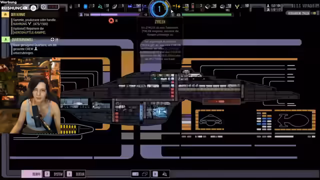 06:47:56Es werden ernsthafte Probleme mit der Energie- und Nahrungsmittelversorgung deutlich. Die Energiekapazität ist knapp, was dazu führt, dass das Schiff in den Modus Grau wechselt und nur noch Notrationen ausgegeben werden. Der Streamer bemerkt, dass zu wenige Arbeiter für die verschiedenen Aufgaben verfügbar sind, was insbesondere die Nahrungsproduktion und die Lebenserhaltung des Schiffes beeinträchtigt. Die Moral der Crew leidet unter den schlechten Bedingungen.