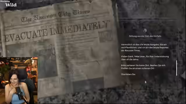 08:59:08Es wird ein Szenario beschrieben, als ob man sich in Raccoon City während eines Zombie-Ausbruchs befindet. Die Empfehlung lautet, die Stadt sofort zu verlassen oder sich zur Polizeistation zu begeben, sich mit allem zu bewaffnen, was man findet, und sich in einem stabilen Gebäude zu verschanzen. Es gibt einen fiktiven Zeitungsartikel aus Raccoon City, der als letzte Ausgabe erscheint und die Bürger zum Fliehen auffordert.