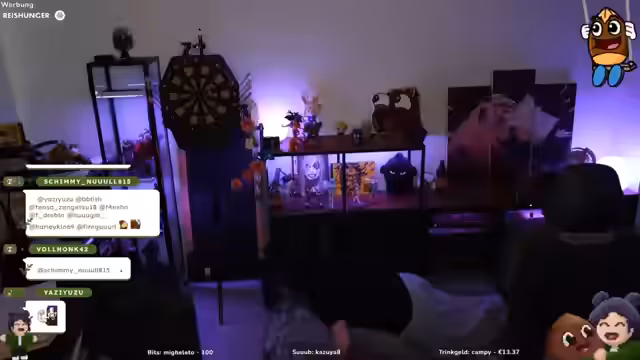 03:33:22Die Stimmung verschiebt sich zu einer persönlichen Note. Der Streamer stellt sein neues Streamingzimmer vor, das mit einem Teppich, Sideboard und Beleuchtung noch angepasst wird. Er zieht Parallelen zur Serie 'Ranma ½' und teilt mit, dass er alte Beiträge eines Pancake-Cosplayers auf Instagram gesehen hat. Die Unterhaltung schweift ab zu der Feststellung, dass Haferbrei fehlt, und endet mit einem Geruchsdiskurs über sein neues Shirt, feste Seife und seine Gedanken zur Serie 'Blacklist'.