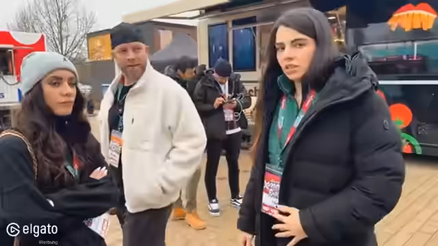 02:33:19Ein Spiel für den Chat wird gestartet: Zuschauer sollen im Hintergrund erkannte Personen namentlich im Chat identifizieren. Dies wird als 'innovatives Spiel' bezeichnet und als alternative Aktivität zum Bingo für das nächste Jahr vorgeschlagen. Hasi und ihr Partner erkennen selbst nur wenige Personen und lassen sich vom Chat unterstützen. Ein Höhepunkt ist die spontane Identifikation von Olaf Scholz im Hintergrund durch einen Zuschauerkommentar.