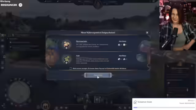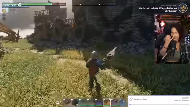 01:20:06Die Erkundung der Spielwelt stand im Mittelpunkt, wobei der Streamer die riesige Karte und deren verschiedene Biome vorstellte. Besonderen Fokus legte er auf die Interaktion mit den im Spiel anstellbaren Bewohnern wie der Bäuerin, Bardin, Jägerin und dem Schmied. Diese kann man platzieren, rufen und bekommt von ihnen Quests sowie Gesprächsoptionen. Der Streamer bemerkte, dass er bisher mehr mit dem Bauen als mit den Bewohnern interagiert hat, und erkundete gleichzeitig die großen Areale der Karte, die bis in rote, tödliche Zonen führen, in denen der Spieler ohne Ausrüstung sofort stirbt.