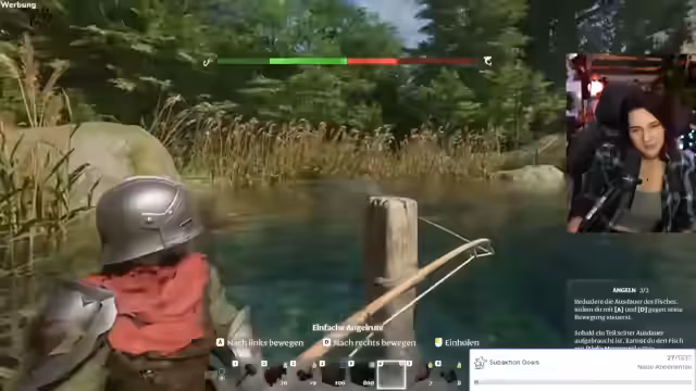 01:32:04Der Entdeckung des Wassers in der Spielwelt wurde große Aufmerksamkeit geschenkt. Das neue Wasser wirkt sehr realistisch mit Wellen und ermöglicht Schwimmen. Nach anfänglicher Angst vor dem Tauchen und der Ähnlichkeit zu Spielen wie Subnautica wagte sich der Streamer hinein. Der Hauptfokus verlagerte sich schnell auf das Angeln, wobei der Streamer nach geeigneten Ködern suchte. Nach erfolgreicher Jagd nach Glühwürmchen als Köder, konnte er erstmals einen Fisch fangen und lernte die Grundlagen der Angelmechanik, bei der man mit der Maus dem Widerstand des Fisches entgegenwirken muss.