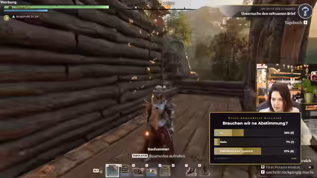03:45:50Nachdem der Hauptbau des Hauses fertiggestellt ist, wird eine Abstimmung im Chat durchgeführt, um die nächste Aktivität zu bestimmen. Die Zuschauer können zwischen Gartenarbeit, Tierzähmen und weiterem Erkunden wählen. Der Streamer signalisiert eine Pause vom intensiven Bauen und denkt über mögliche neue Tätigkeiten im Spiel nach. Die Umfrage selbst endet allerdings etwas unglücklich, da das Ergebnis nicht klar mitgeteilt wird, was zu einem scherzhaften 'Demokratie ist Quatsch'-Moment führt.