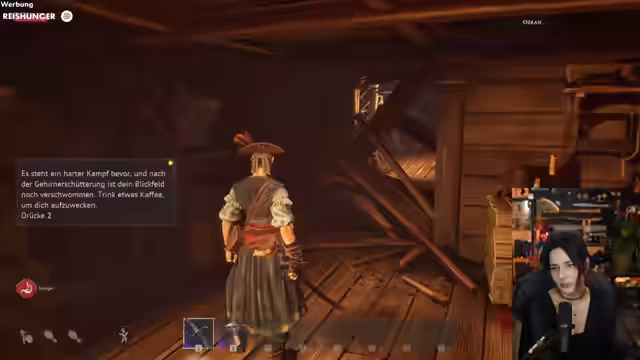 04:22:18Nachdem das Spiel ausgewählt ist, beginnt die Geschichte in der Welt von Windrose. Der Spieler wacht in einer Piratenkabine auf, angegriffen von Feinden. Nach einer ersten Konfrontation stellt der Spieler fest, dass sein Schiff gestürmt wurde und die Crew dezimiert ist. Die erste Aufgabe besteht darin, das Schiff zu verteidigen und den Anführer Blackbeard zu konfrontieren, um das Artefakt zu sichern.