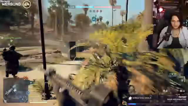 02:41:31Die Spielerin findet sich in einem intensiven Gefecht wieder, bei dem sie zunächst Schwierigkeiten hat, sich zu orientieren und aktiv am Kampfgeschehen teilzunehmen. Sie äußert Frustration über die Unübersichtlichkeit und die scheinbare Hilflosigkeit, als sie nur zusehen kann, wie sie überrollt wird. Nach einigen Versuchen gelingt es ihr jedoch, in ein Fahrzeug zu gelangen und aktiv mitzuballern, was sie mit großer Begeisterung kommentiert. Trotz des anfänglichen Chaos und der wiederholten Tode bleibt die Stimmung energiegeladen. Die Frage, ob Verbündete versehentlich getroffen werden können, bleibt im Raum stehen, während sie versucht, die Mechaniken des Spiels zu verstehen. Die Eroberung von Territorien durch den Feind sorgt für zusätzliche Spannung und den Wunsch, schnell wieder ins Geschehen einzugreifen. Die Dynamik des Spiels, geprägt von schnellen Wechseln zwischen Offensive und Defensive, hält die Spielerin und das Publikum in Atem.