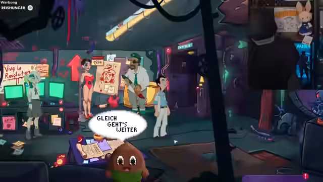 02:59:18Die Geschichte setzt sich in einem alten KGB-Horchposten fort. Die Charaktere erkunden eine geheime Basis in einem Vulkan mit einem Helikopter. Dabei werden verschiedene Gegenstände und Geräte gefunden, wie ein 'Nukular-Reaktor' und ein 'P-Bot'. Es gibt Diskussionen über einen selbstlernenden Algorithmus und den Versuch, das Gerät zu hacken, was zu einer seltsamen Interaktion führt.