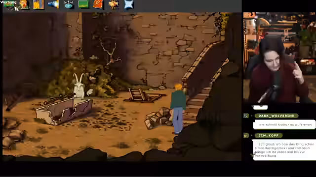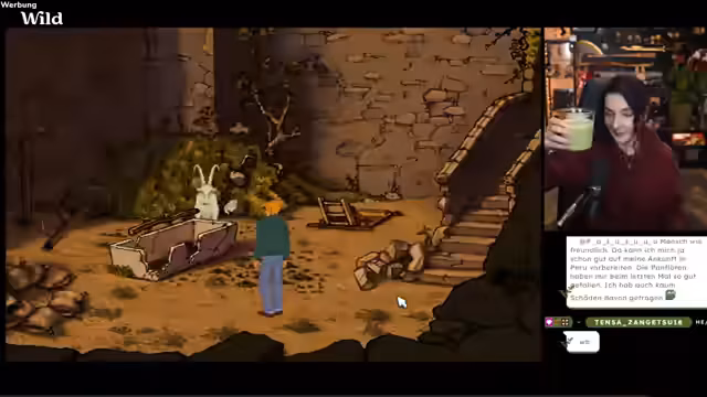 05:27:33Ein neues Rätsel stellt sich mit einer Ziege, die sich scheinbar nicht steuern lässt. Der Streamer verbringt viel Zeit damit, die Ziege durch eine Leine zu bewegen und versucht, sie an bestimmte Stellen zu bringen, was aber wegen der limitierten Bewegungsradius und langsamen Animationen immer wieder scheitert. Nach diesem frustrierenden Segment widmet er sich wieder einem klassischen Point-and-Click-Puzzle, indem er Gegenstände wie einen Stein mit fünf Löchern im Sand platziert und sie mit Gips füllt.