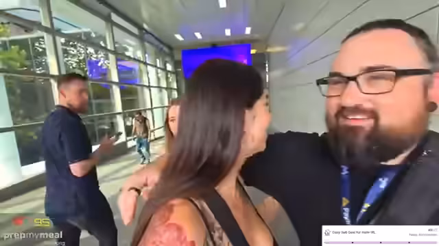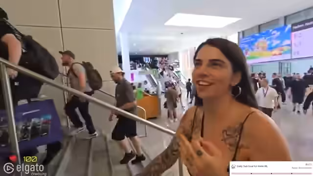 08:25:28Die Streamerin kehrt zurück, das Wiedersehen ist emotional. Der Streamer, der vorher die Moderation innehatte, übergibt ihr schlussendlich die Schlüssel und verabschiedet sich. Er muss sich nun auf den Weg zum Hotel machen und seine verbleibende Zeit vor der Abreise sinnvoll nutzen. Die Streamerin plant, die restlichen Hallen zu erkunden und kündigt weitere Aktivitäten an.