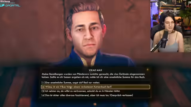 06:40:29Der Streamer nimmt an einer geheimnisvollen Quest teil, bei der er versucht, Informationen über ein seltenes Buch zu erhalten. Er nutzt Überzeugungsstrategien, um NPCs zu beeinflussen und Fortschritte zu machen. Dieses Segment zeigt die strategische Tiefe des Gameplay und die Interaktion mit dem Spiel-System.