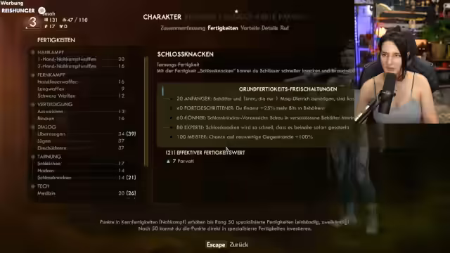 06:43:30Der Streamer erklärt und demonstriert Kampffähigkeiten, einschließlich Nahkampf- und Fernkampf-Techniken. Er verteilt Fähigkeitspunkte und entwickelt seinen Charakter weiter. Dieses Segment zeigt die technischen Aspekte des Spiels und die strategische Planung des Streamers.