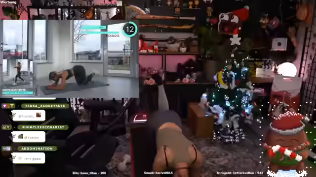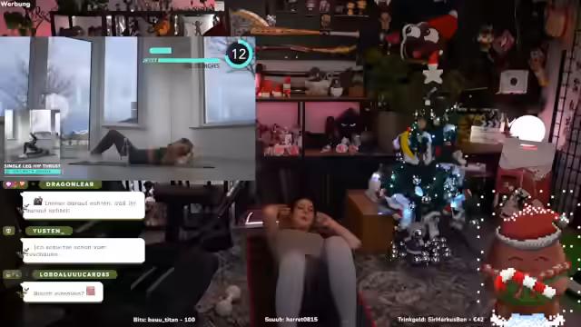 03:41:54Es werden Adventskalendertürchen geöffnet, darunter Ketchup Manis, dessen Ursprung diskutiert wird. Anschließend folgt ein 15-minütiges intensives Workout. Die Übungen umfassen Bauchcrunches mit Wasserflasche, Beinheben, Side Crunches und Hip-Trusts mit Miniband. Der Streamer gibt detaillierte Anweisungen zur korrekten Ausführung, fordert auf, Pausen einzuhalten und auf eine saubere Haltung zu achten.