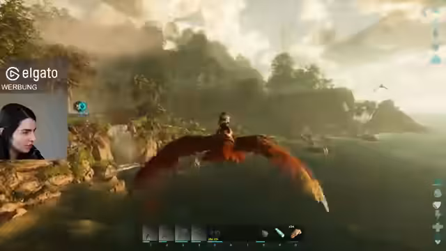 01:14:49Der Streamer setzt seine Suche nach dem Flugdino Argentavis fort und muss sich dabei durch gefährliches Terrain und feindliche Kreaturen wie T-Rex und Raptoren kämpfen. Nach mehreren gescheiterten Versuchen gelingt es ihm schließlich, einen Vogel zu fangen, den er nach einem Pokémon benennt. Der gefangene Vogel wird daraufhin ausgerüstet und in seine neue Heimat gebracht, wo er zukünftig eingesetzt werden soll.